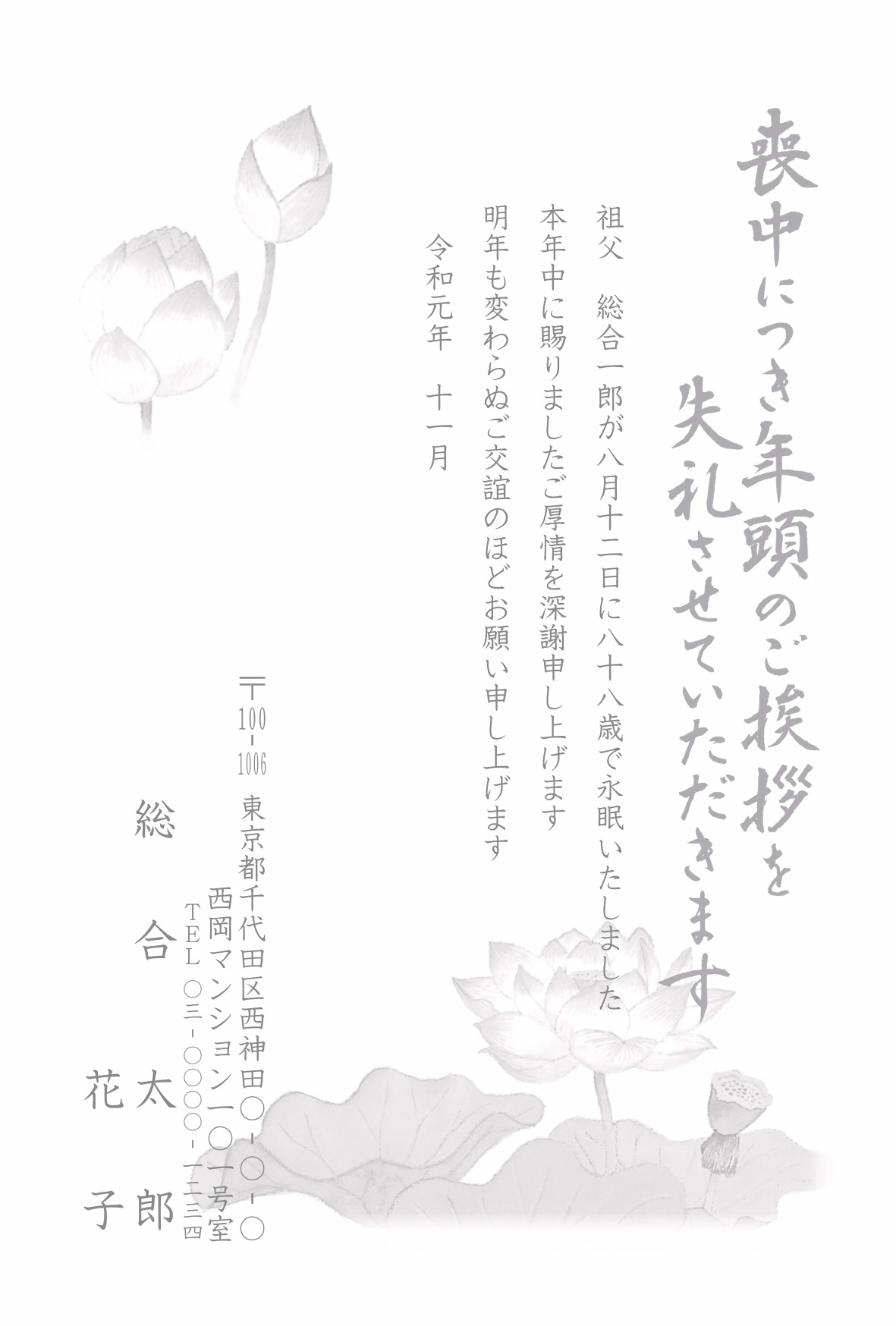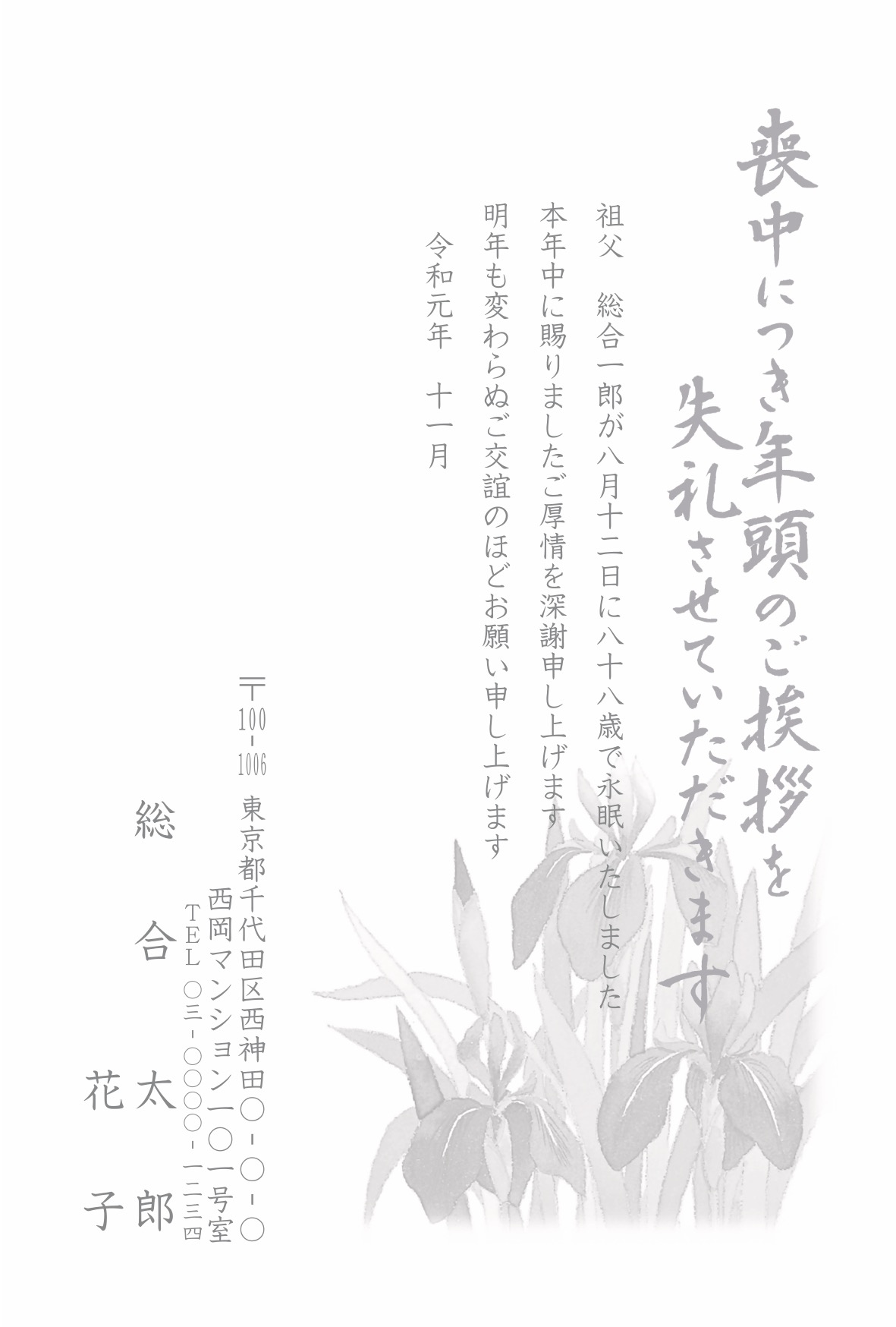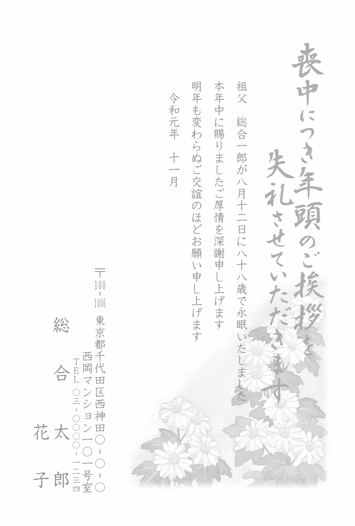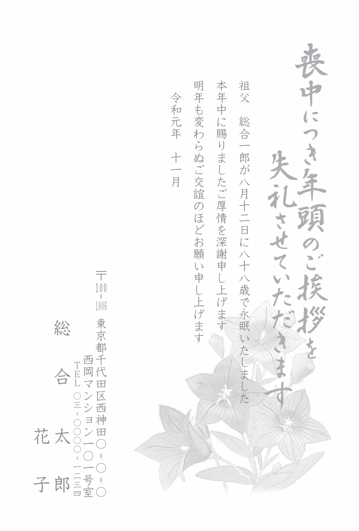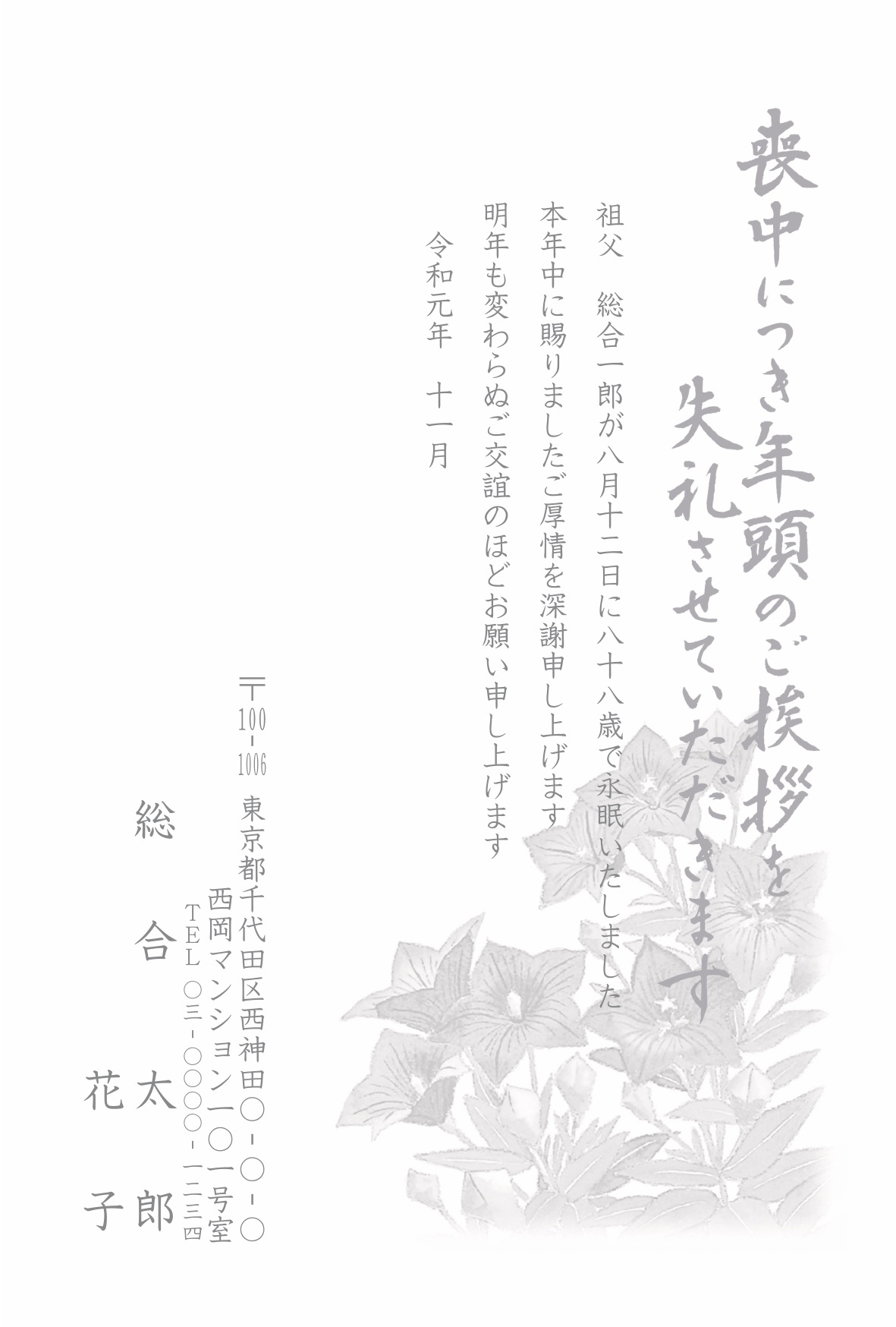 グレー文字がイラストにかかっても見やすいように、イラストの色を抑えています。 全体的に、しっとりと落ち着いた感じの喪中はがきになります。